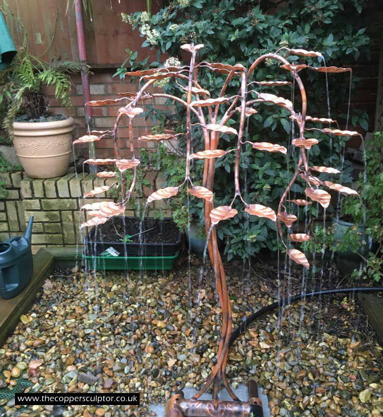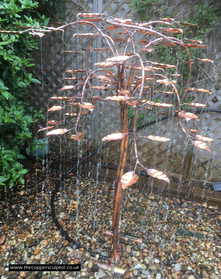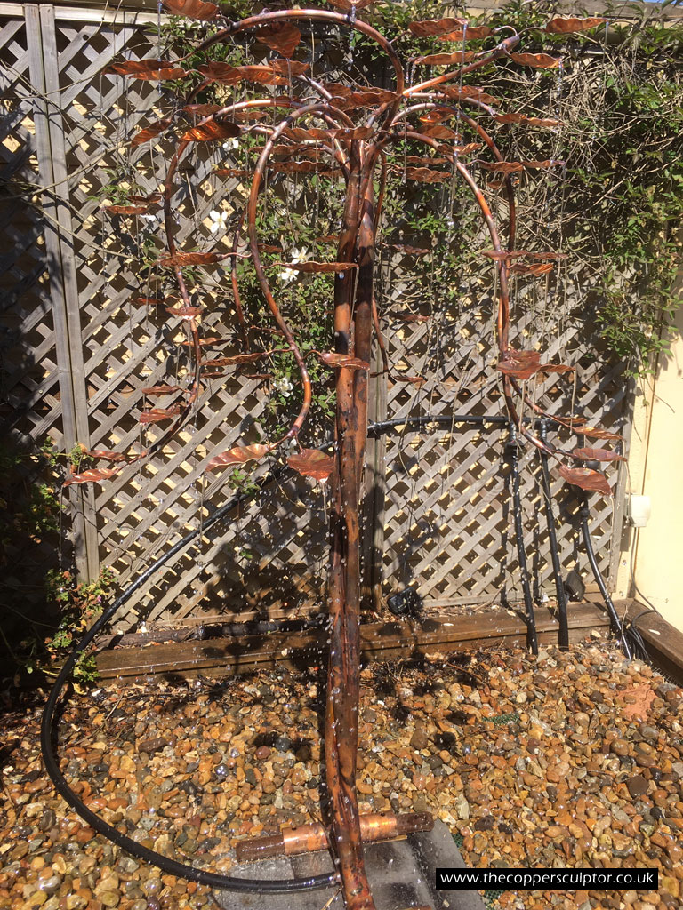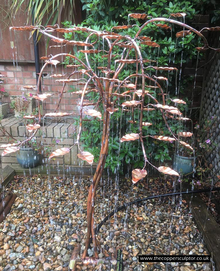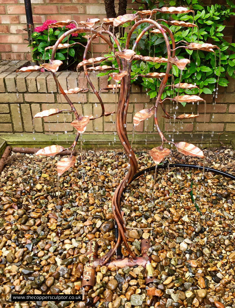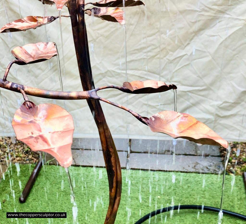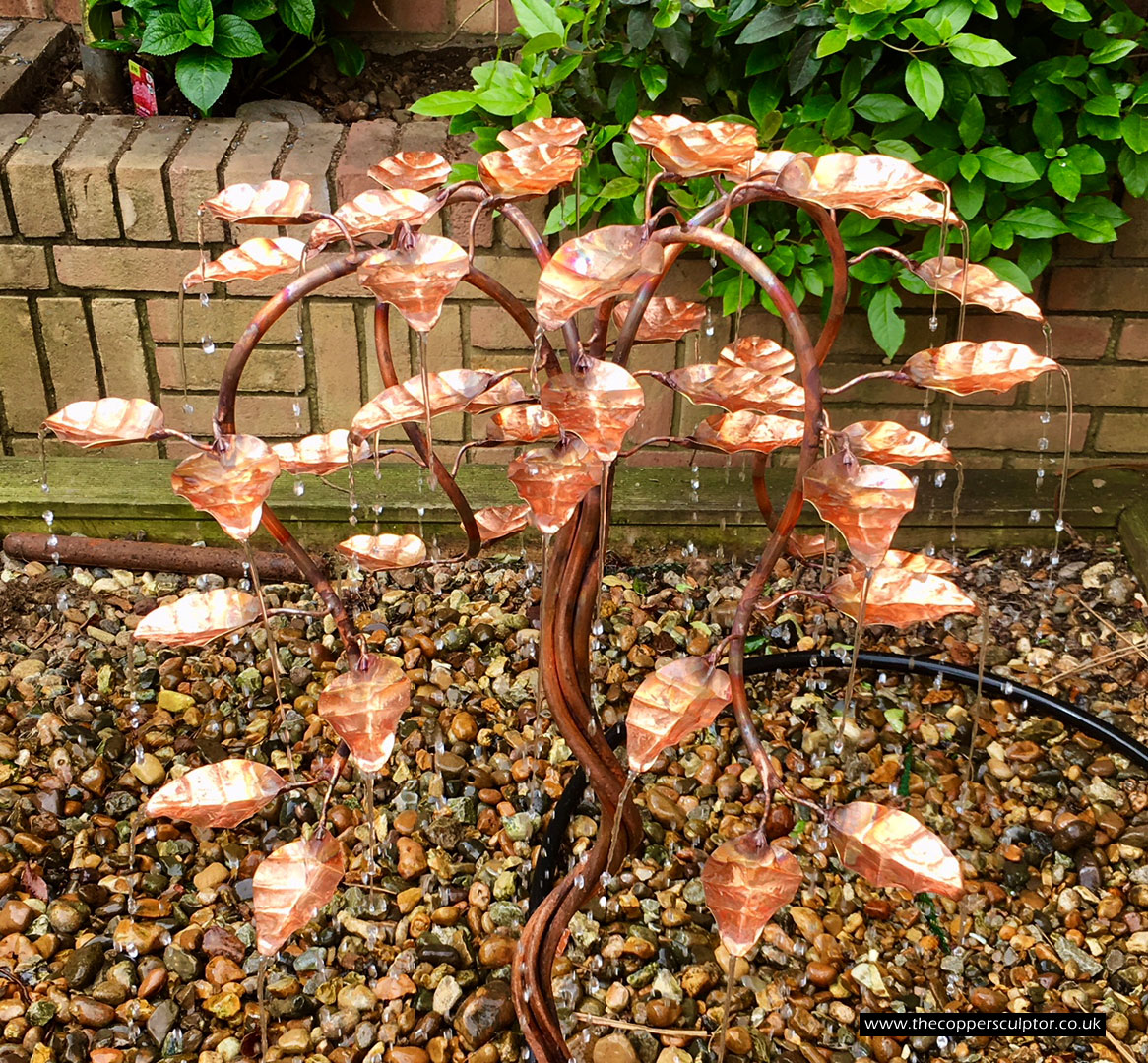 item no:18/8ET/AR Copper tree water feature. Approx 1200mm in height, 900mm in width and 900mm in depth with approx 75 water fed leaves. In situ photos