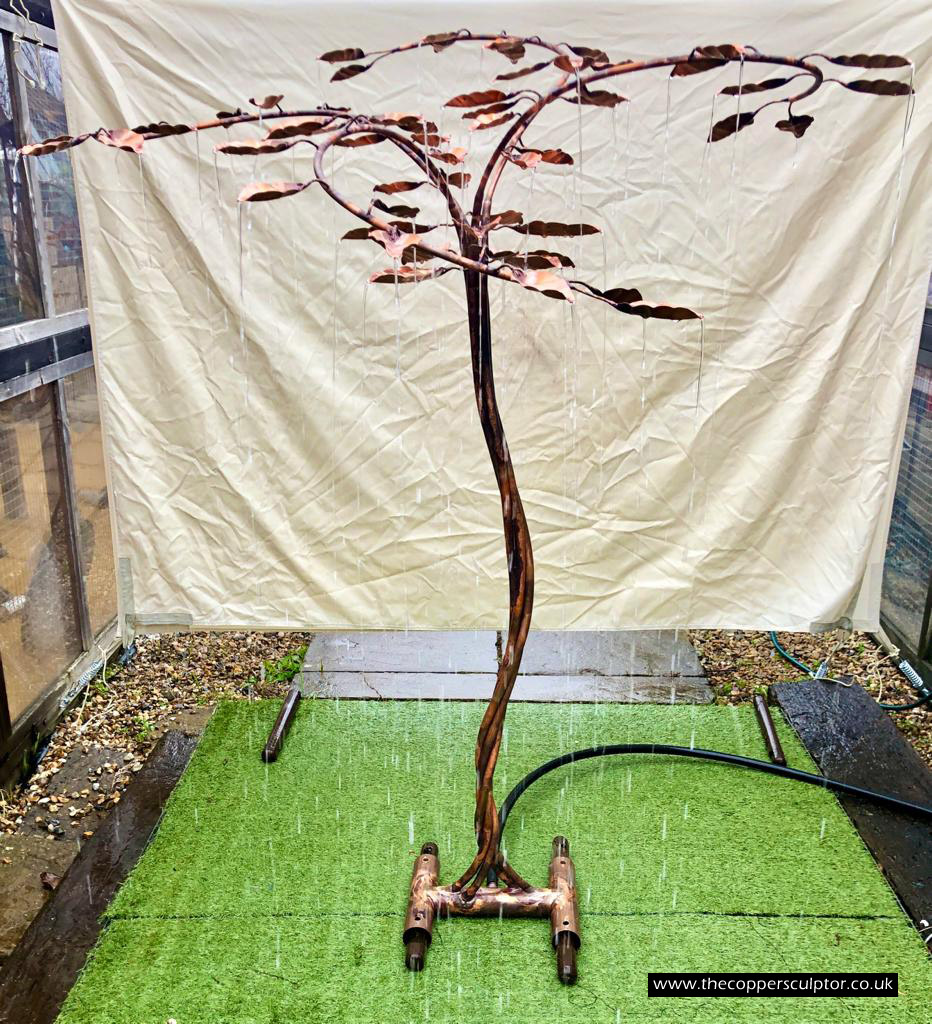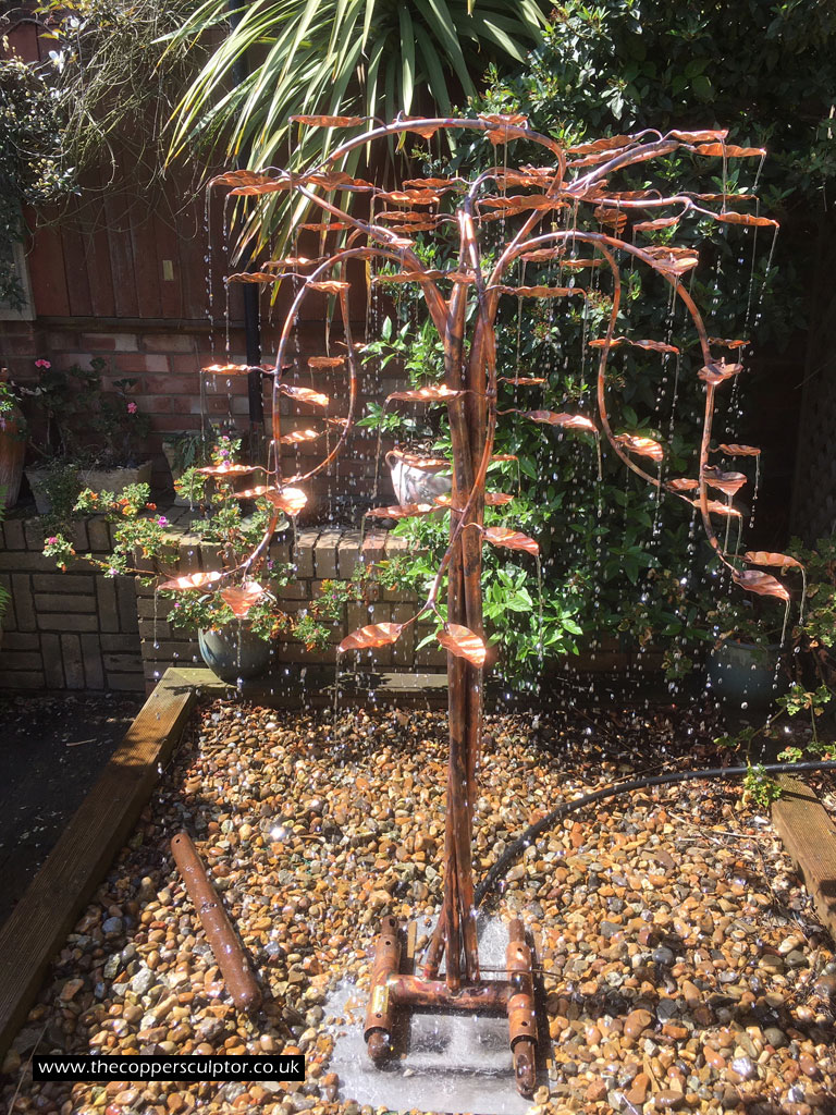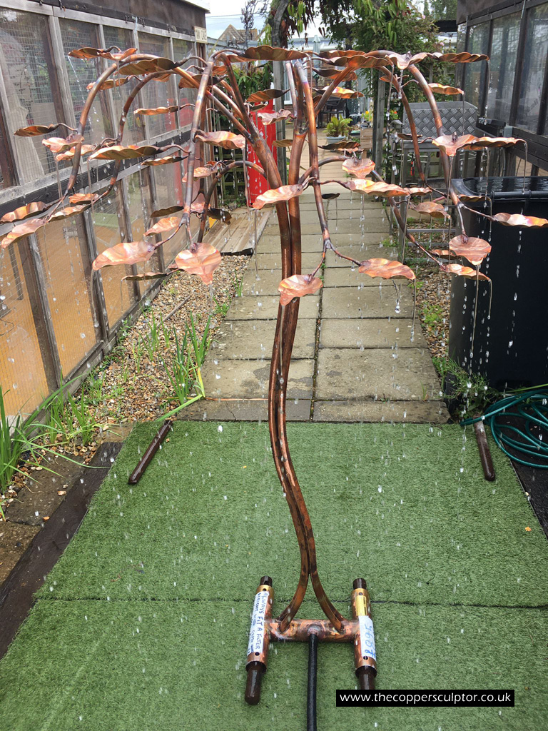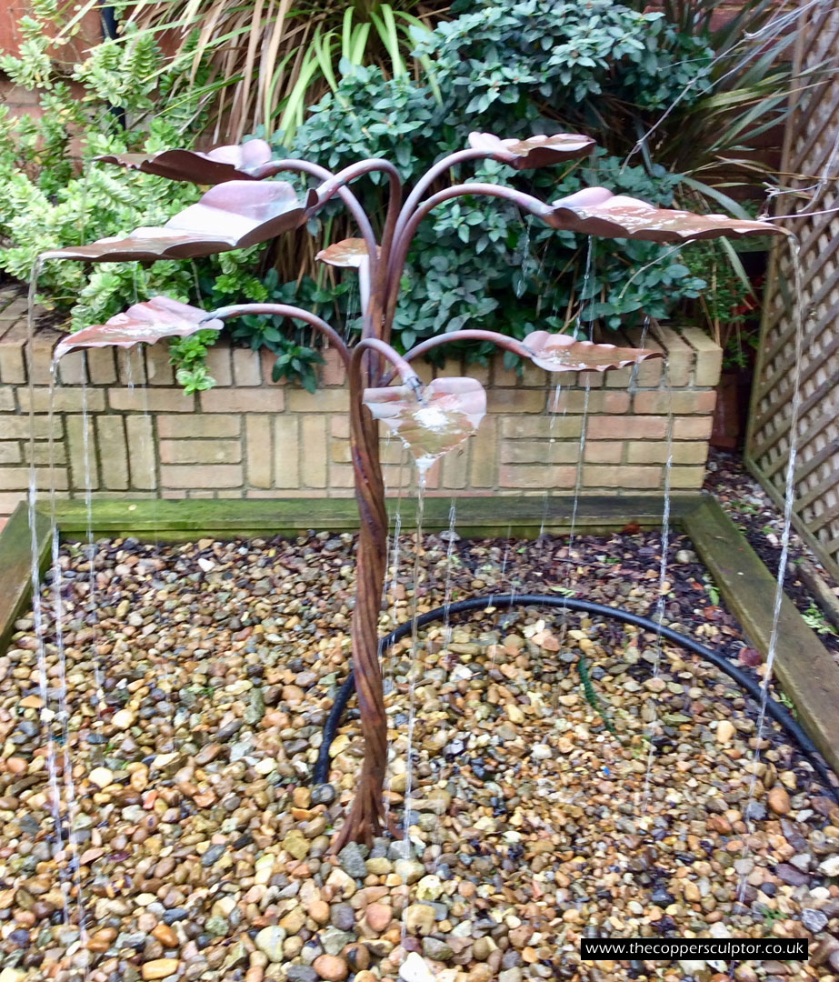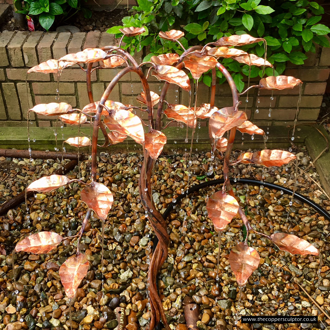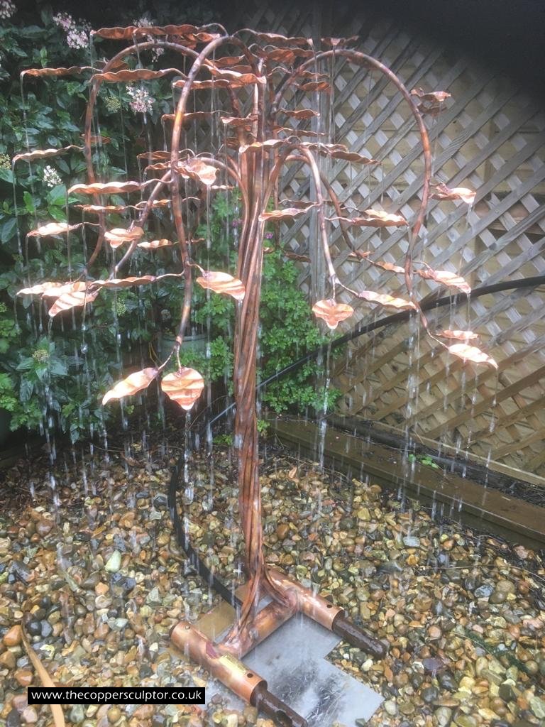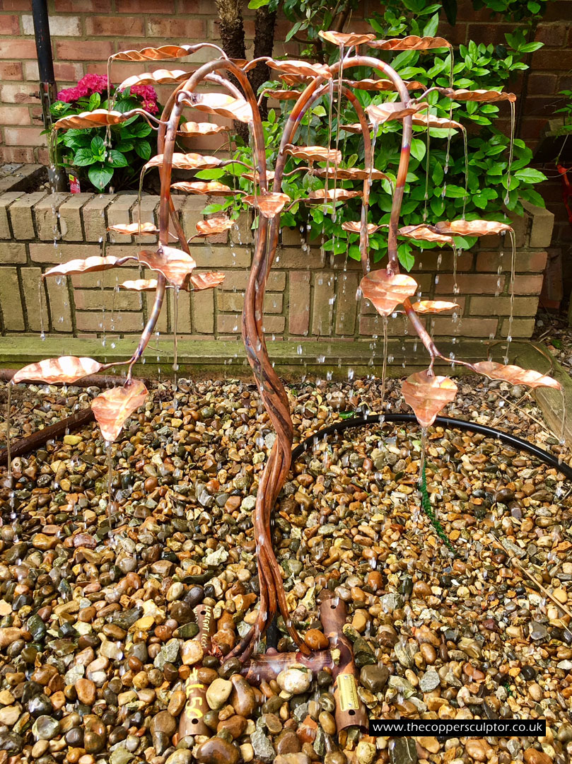 item no:18/8ET/AR Copper tree water feature. Approx 1200mm in height, 900mm in width and 900mm in depth with approx 75 water fed leaves. In situ photos