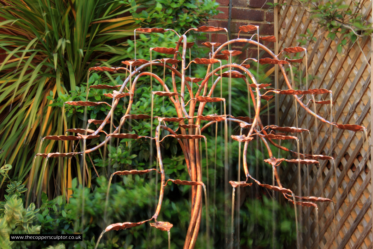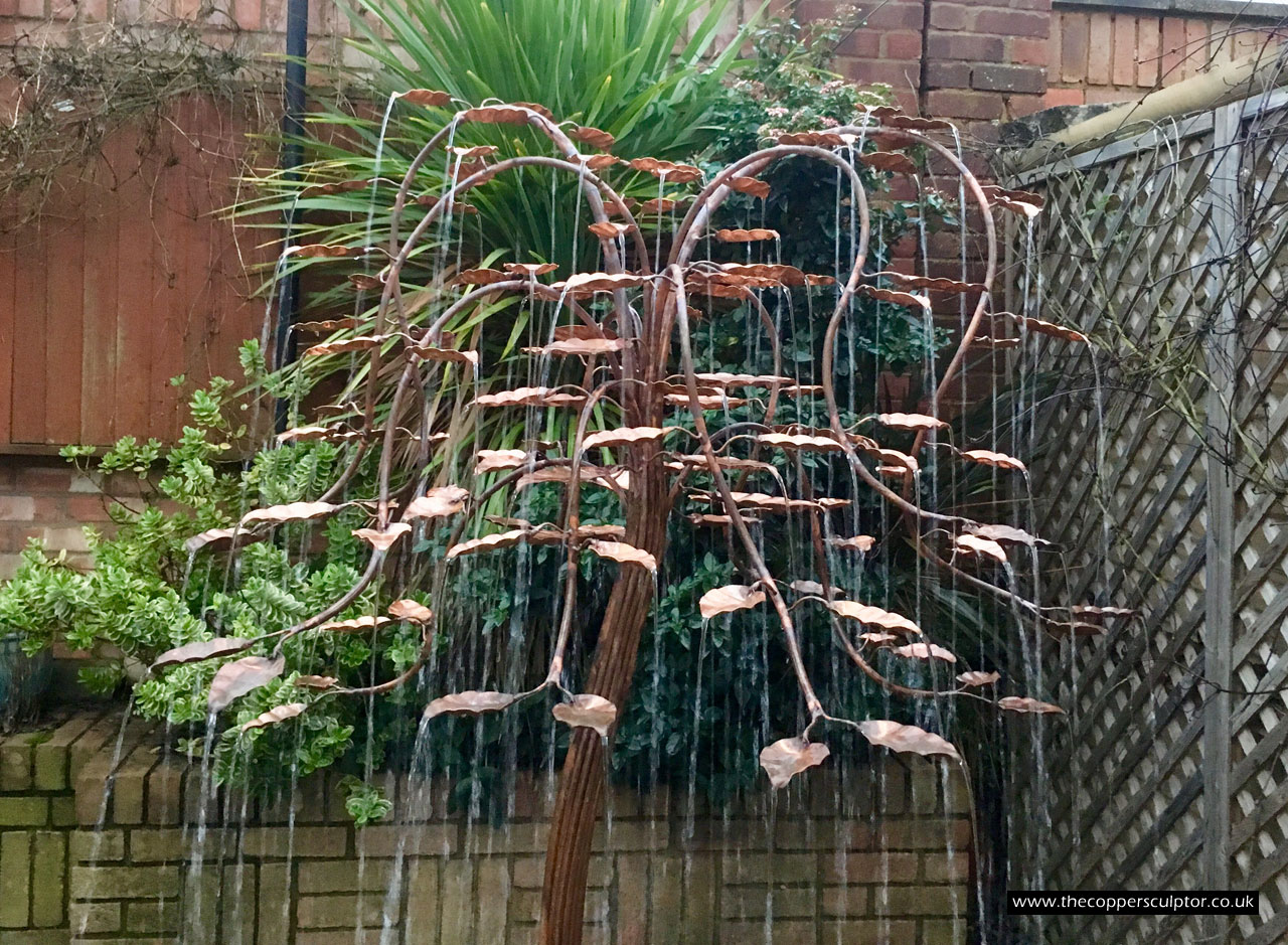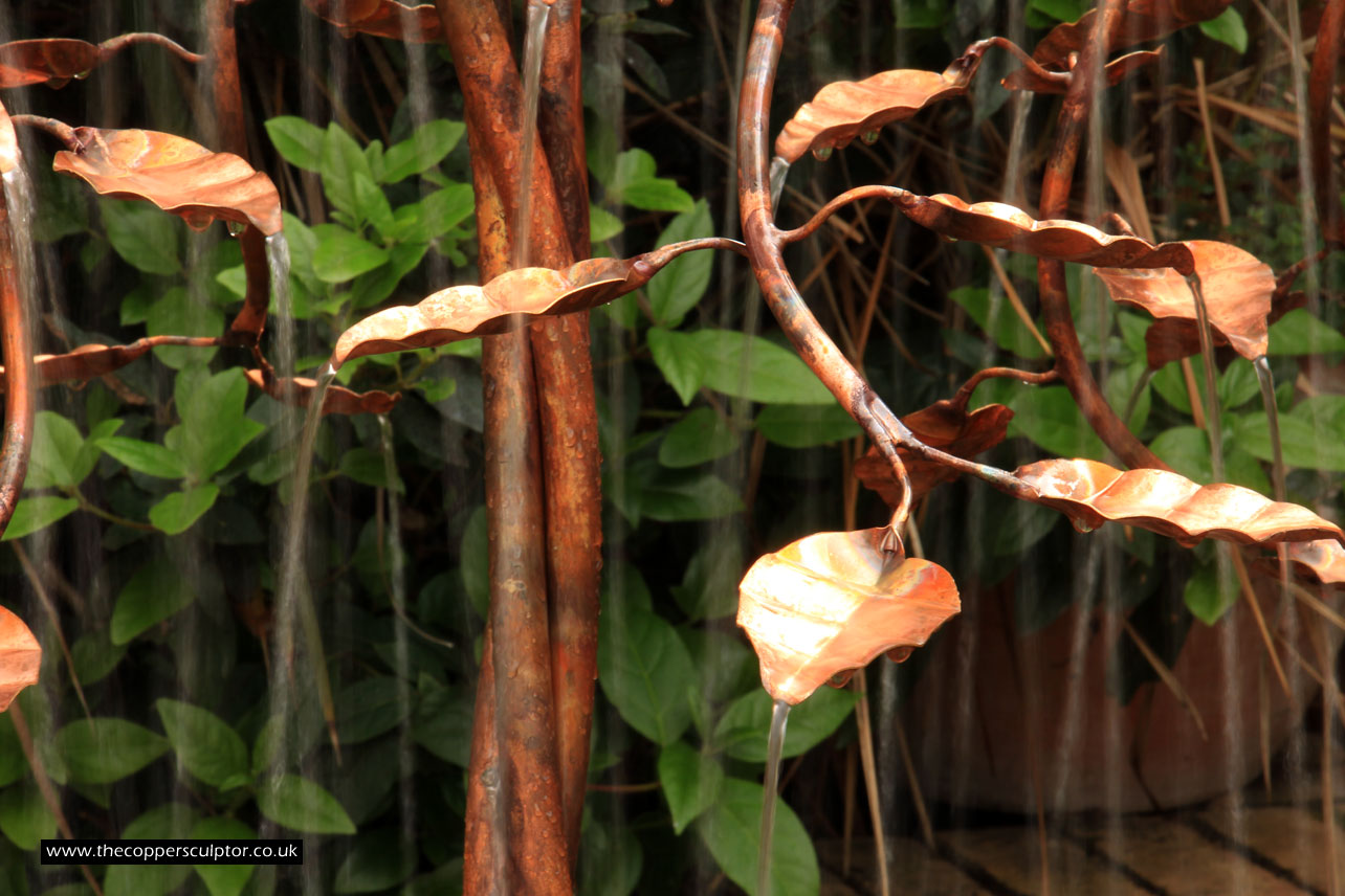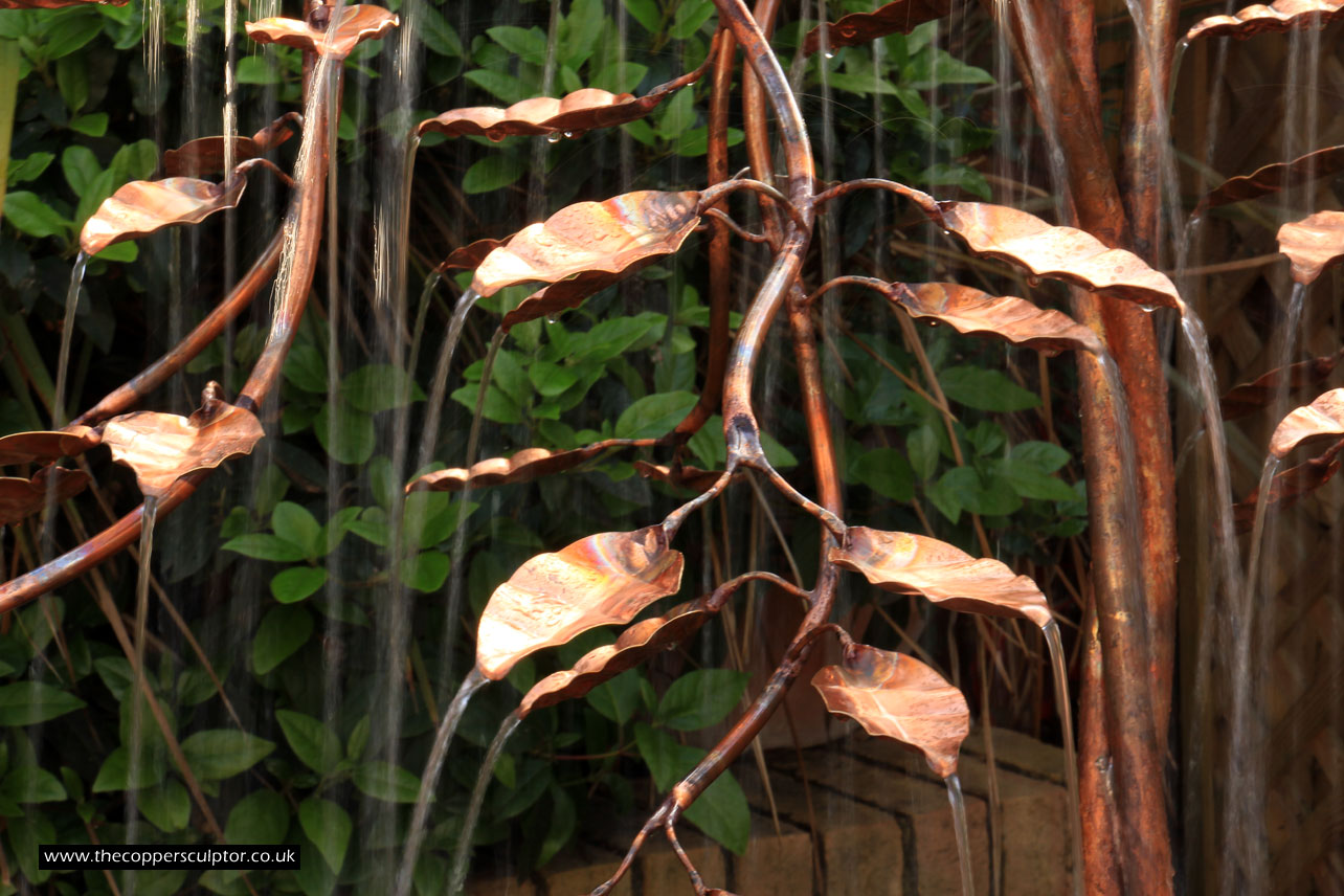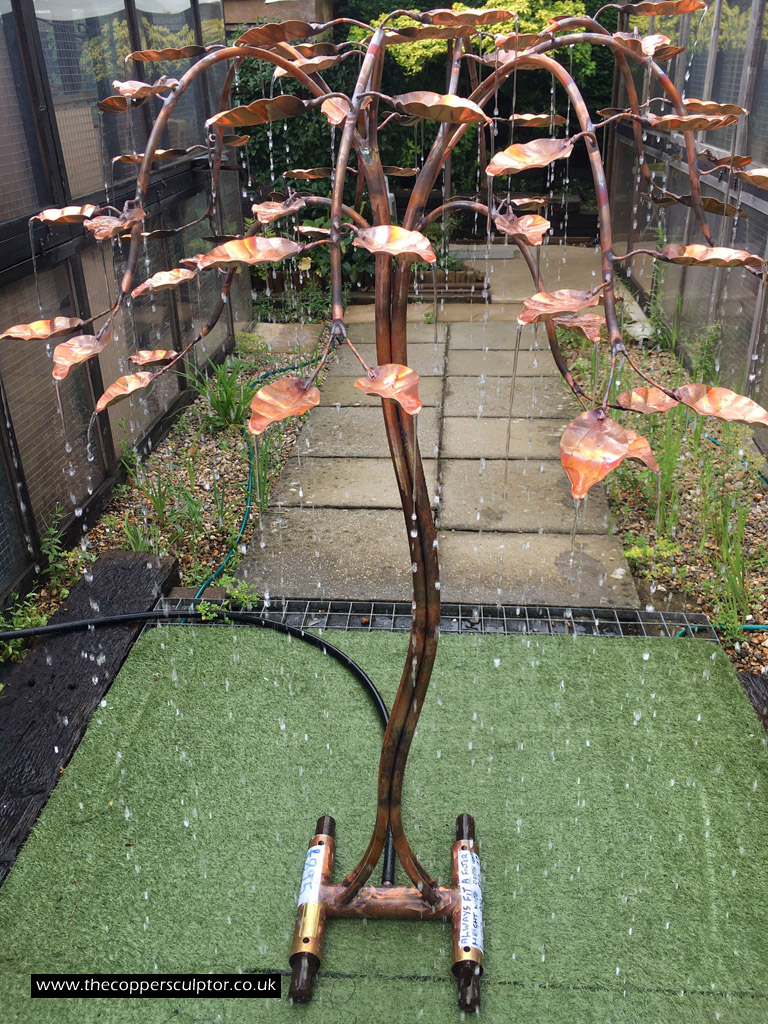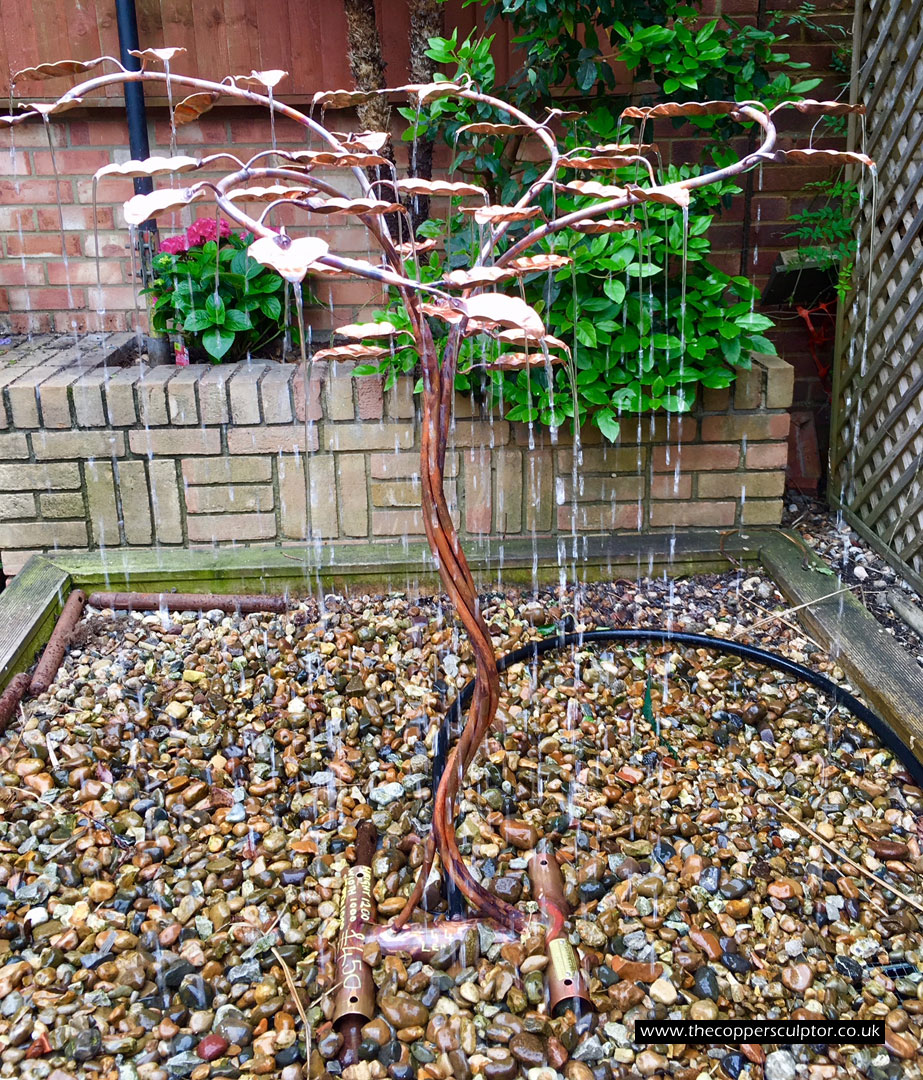 item no:18/8ET/AR Copper tree water feature. Approx 1200mm in height, 900mm in width and 900mm in depth with approx 75 water fed leaves. In situ photos