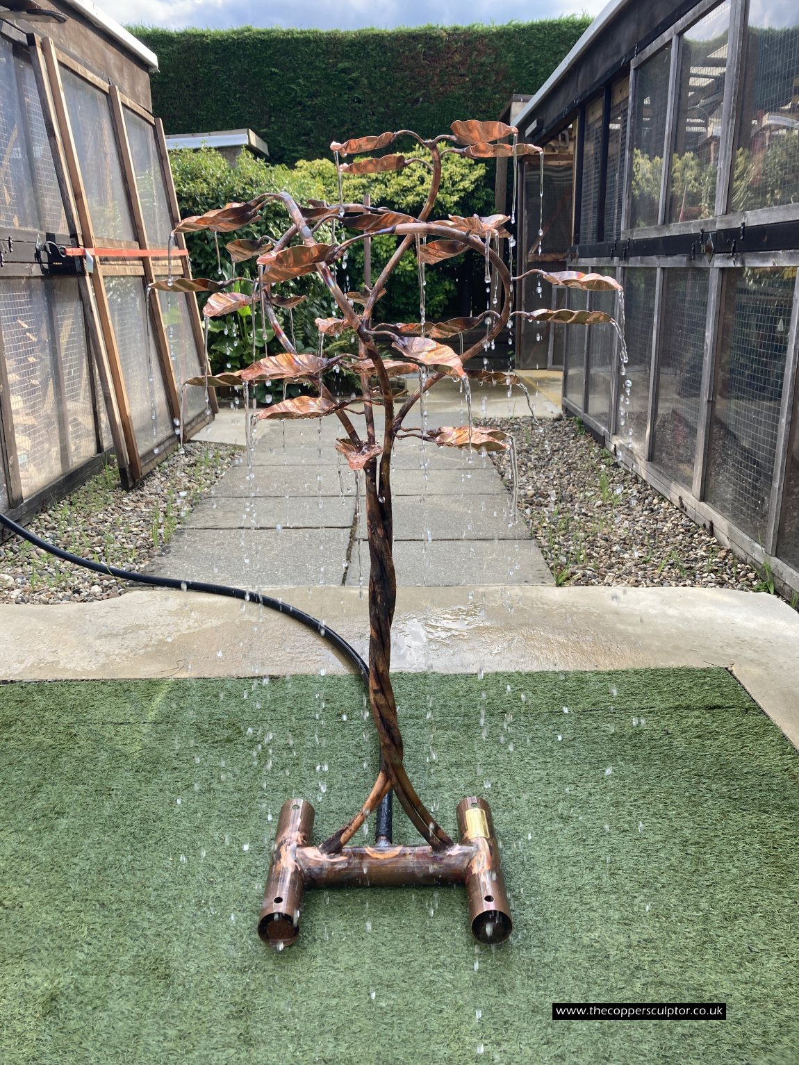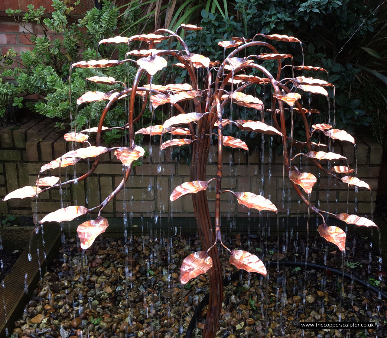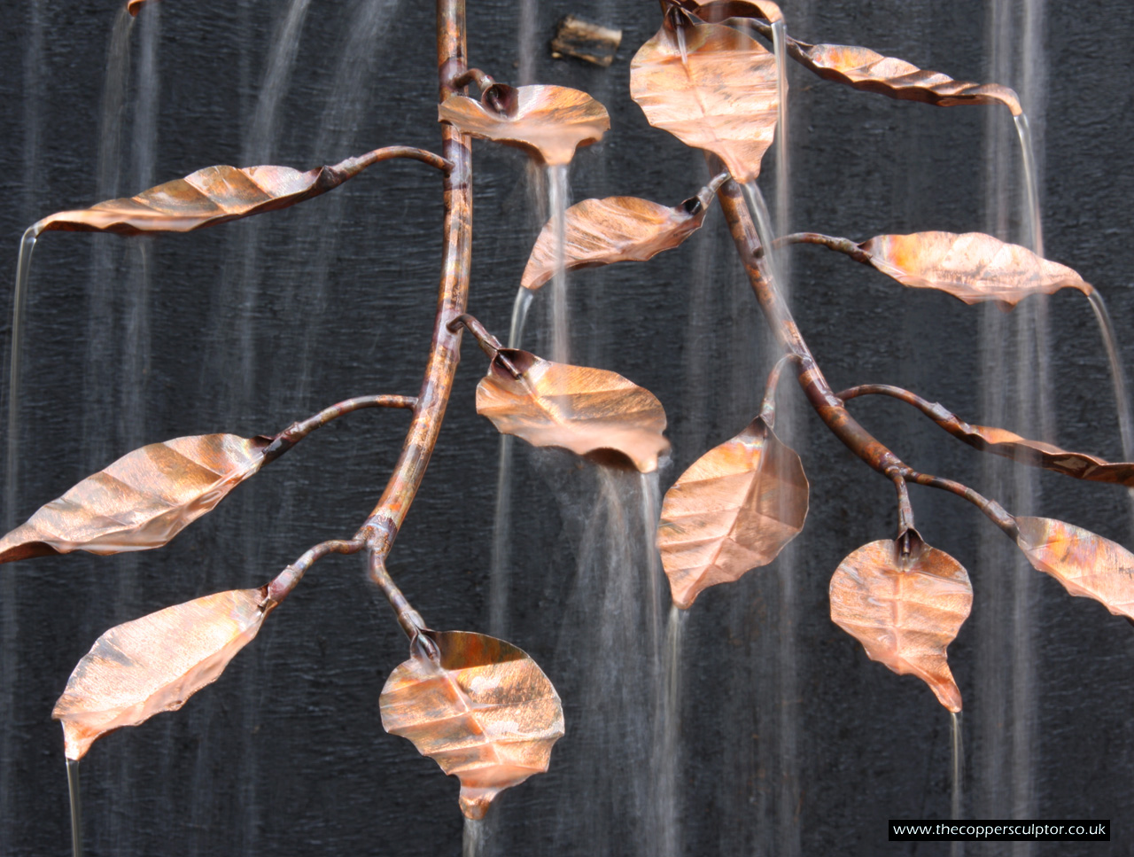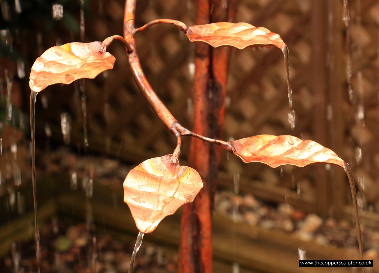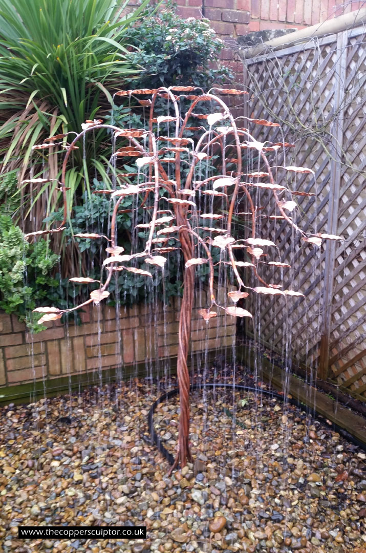 item no:18/8ET/AR Copper tree water feature. Approx 1200mm in height, 900mm in width and 900mm in depth with approx 75 water fed leaves. In situ photos