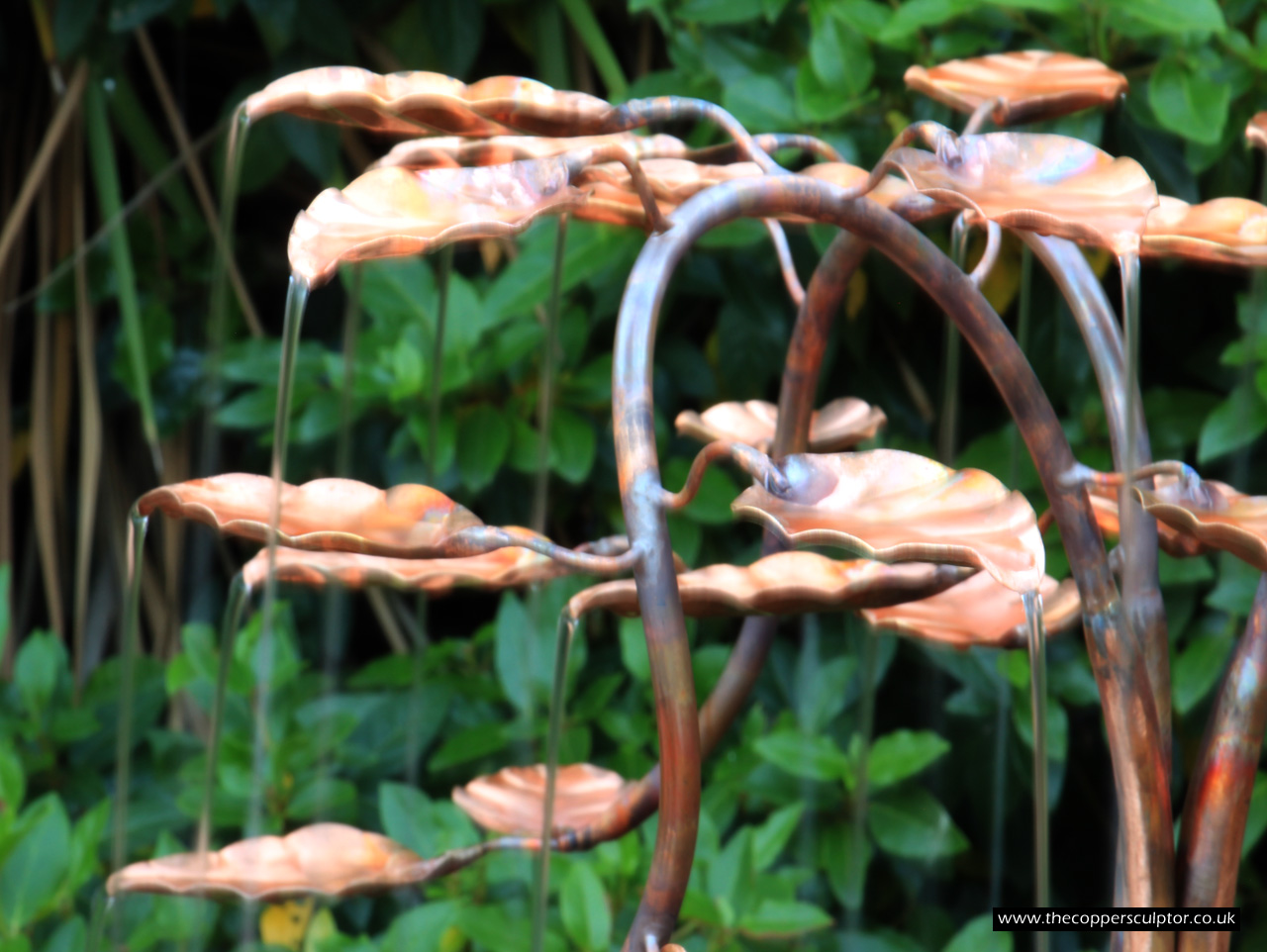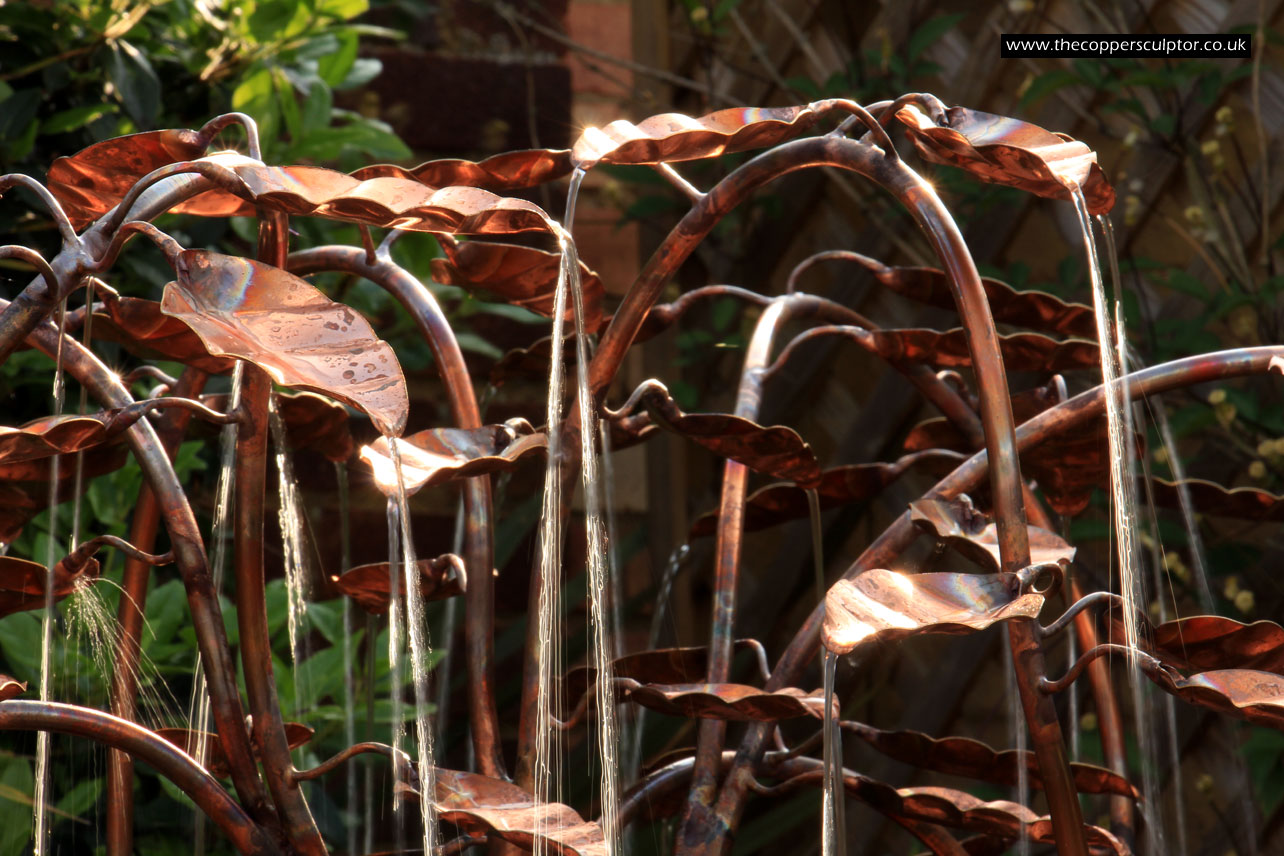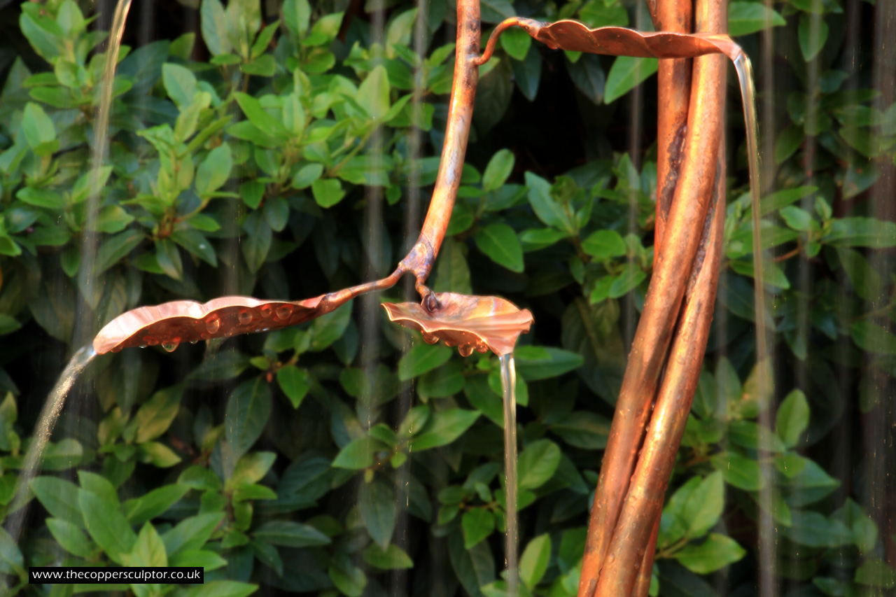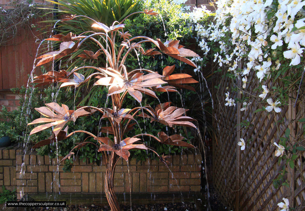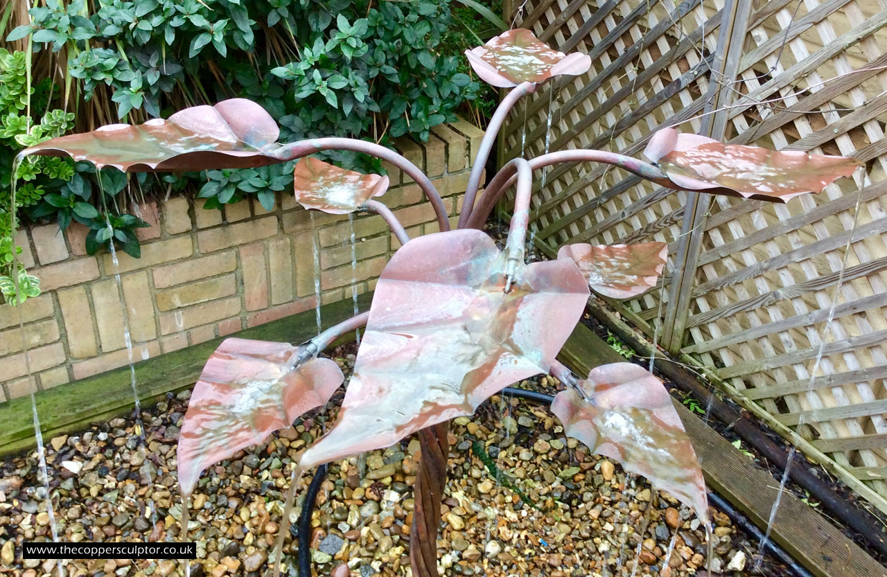 item no:4/10AR Copper water feature. Height 1100 mm, depth 660 mm, width 660 mm, elegant 4 stem 13mm trunk, 42 water fed leaves.