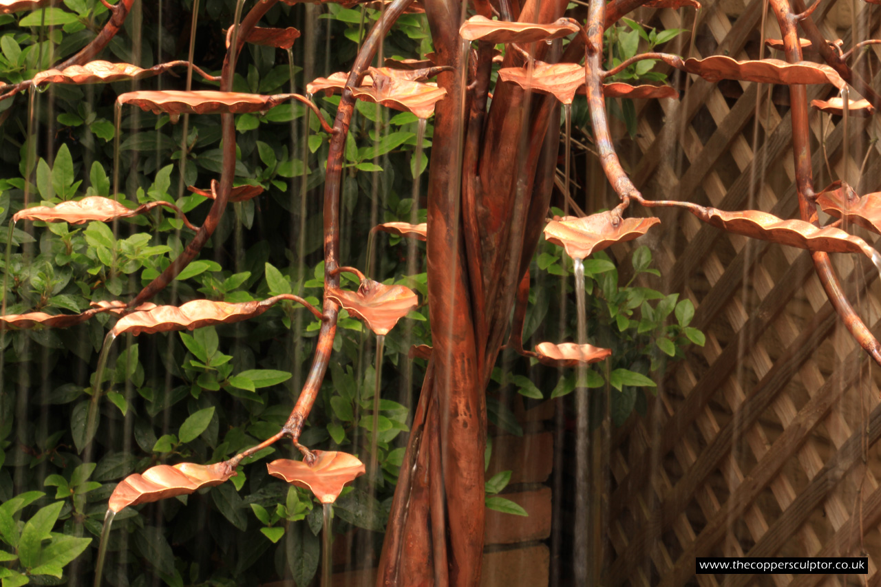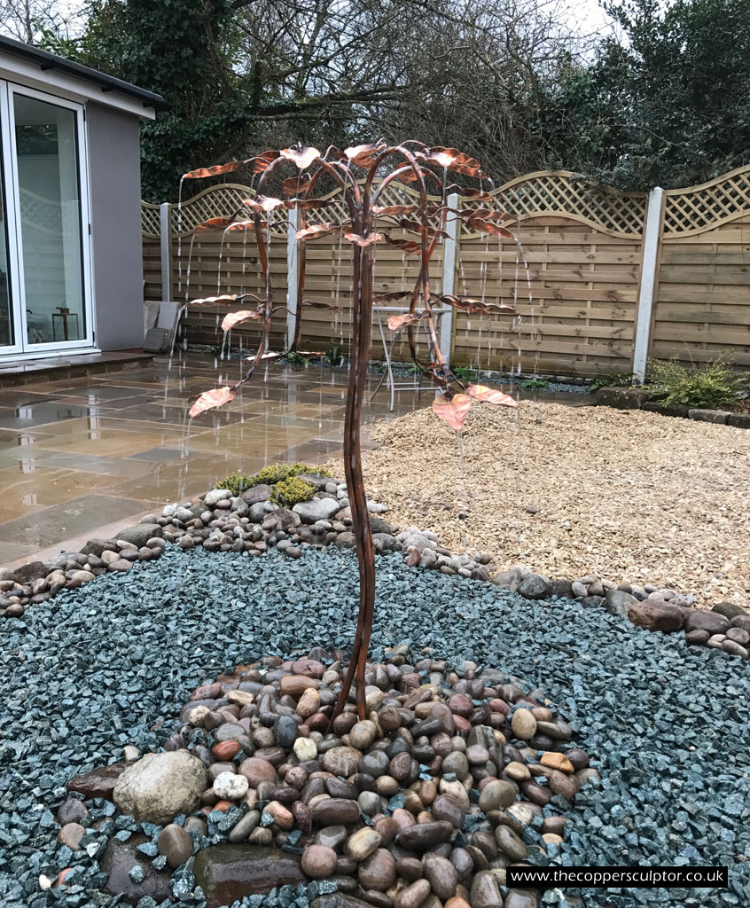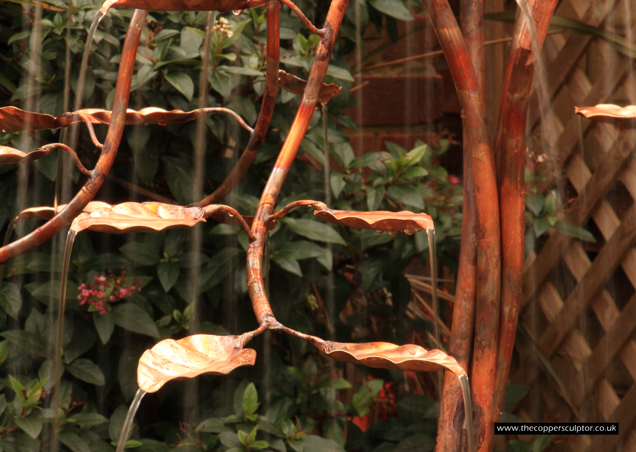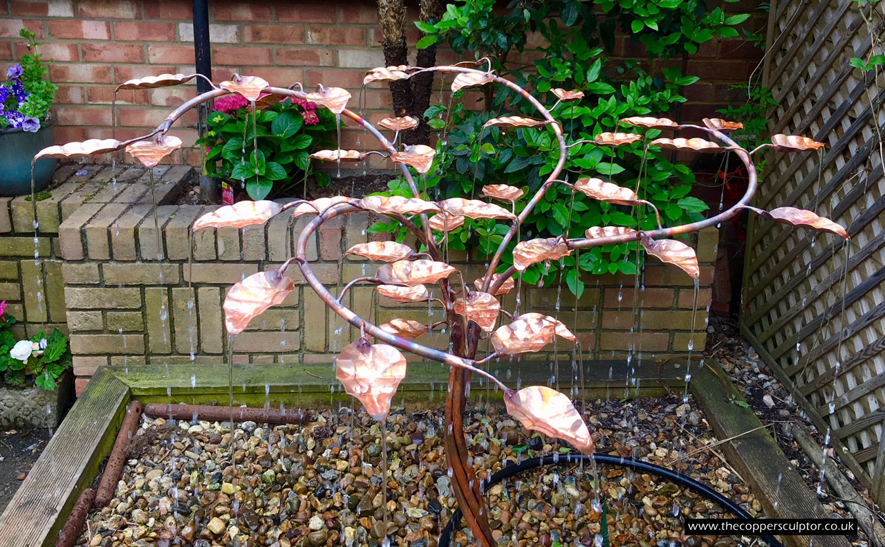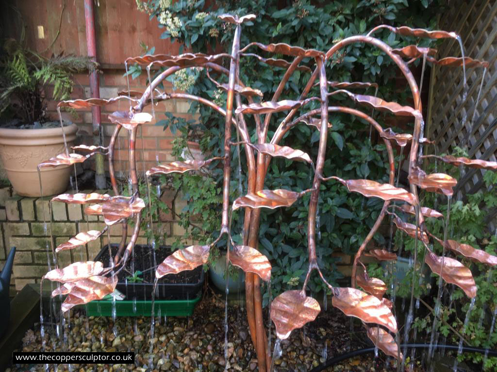 item no:18/8ET/AR Copper tree water feature. Approx 1200mm in height, 900mm in width and 900mm in depth with approx 75 water fed leaves. In situ photos