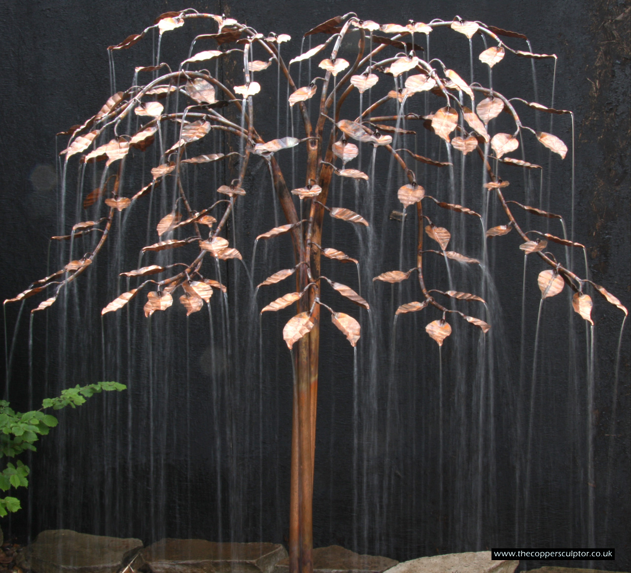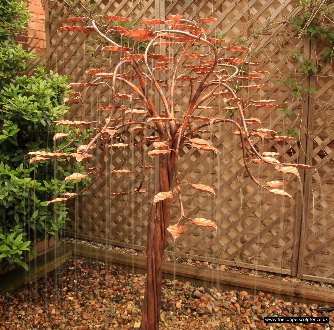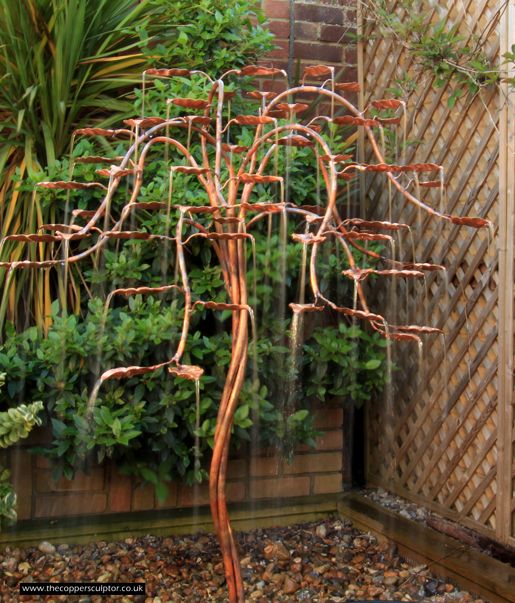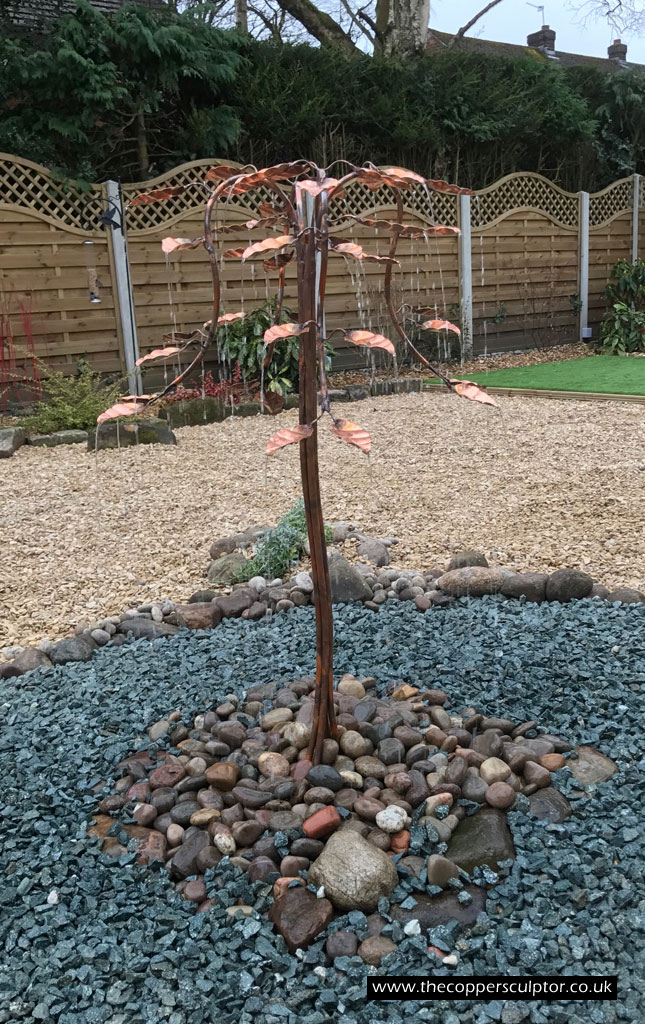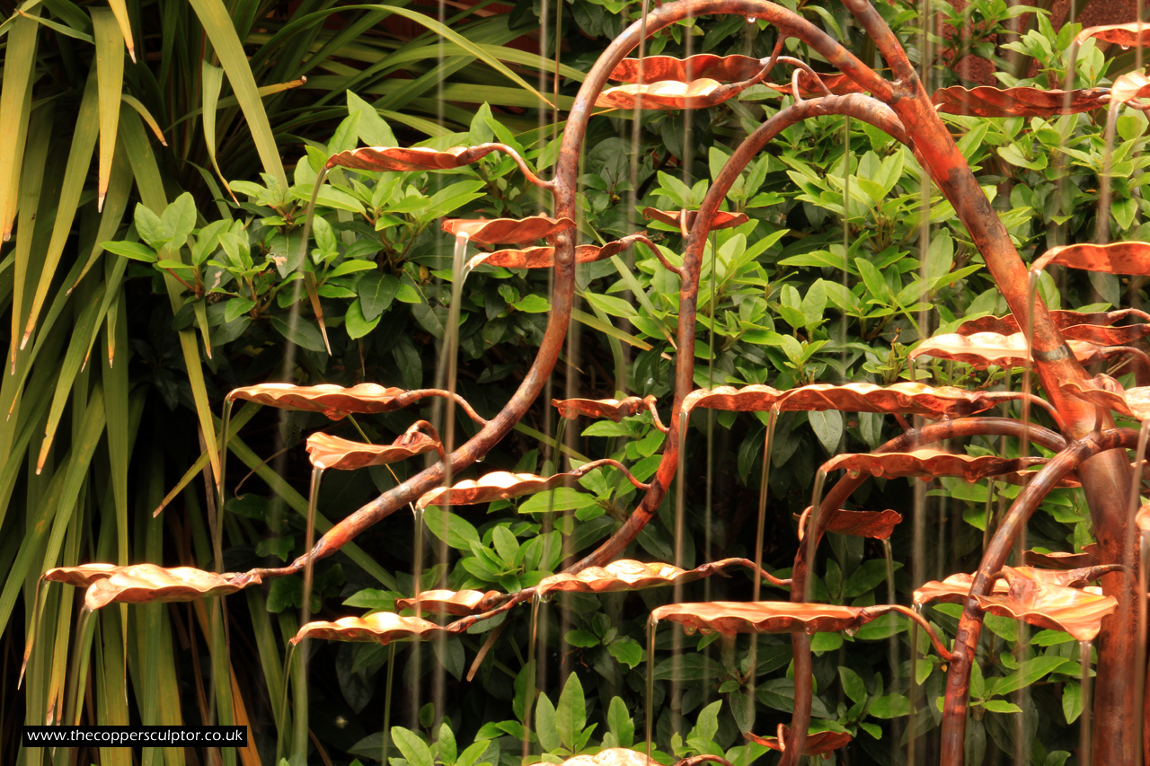 item no:18/8ET/AR Copper tree water feature. Approx 1200mm in height, 900mm in width and 900mm in depth with approx 75 water fed leaves. In situ photos