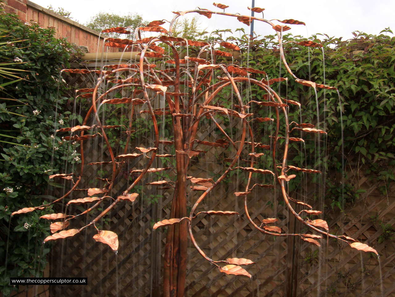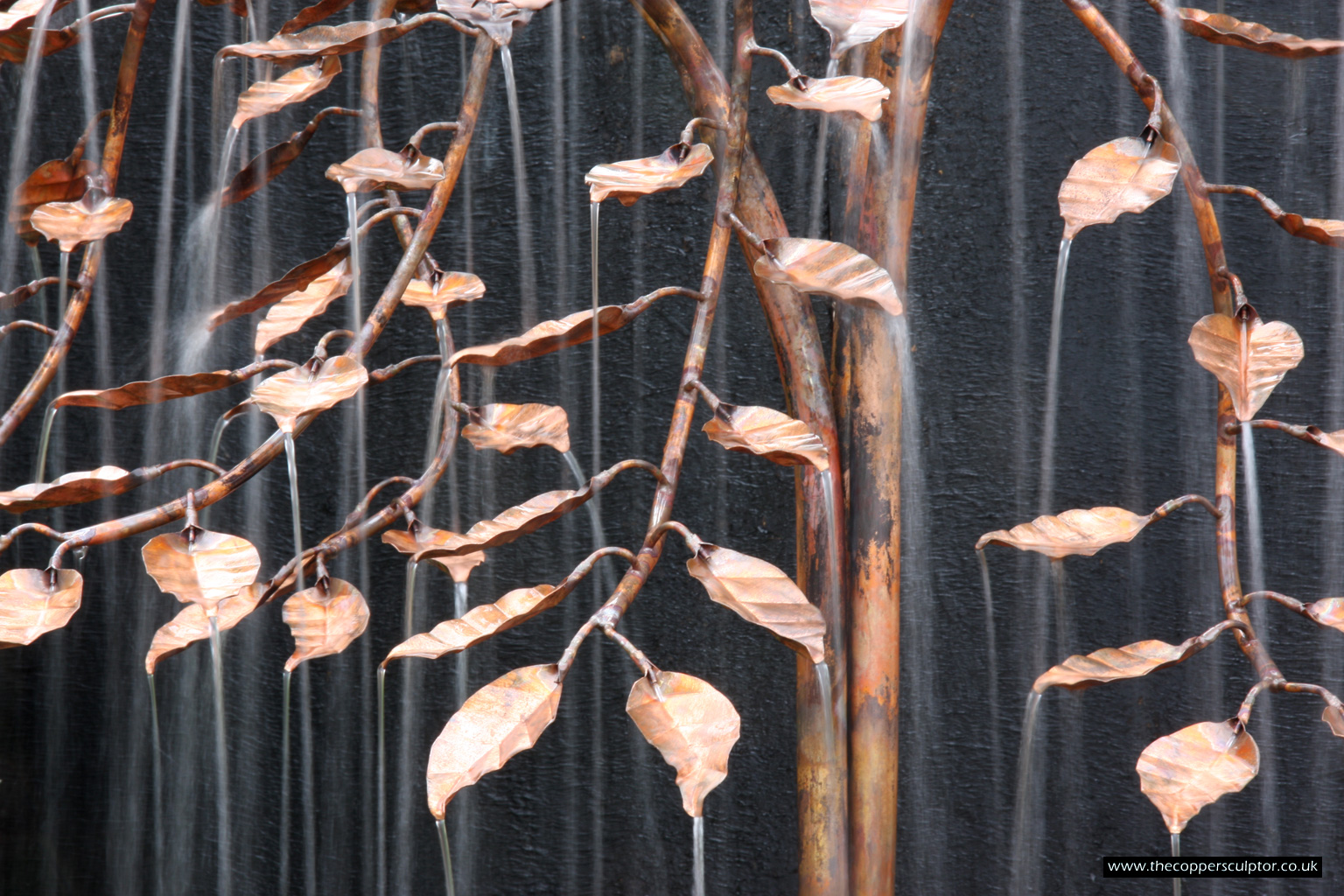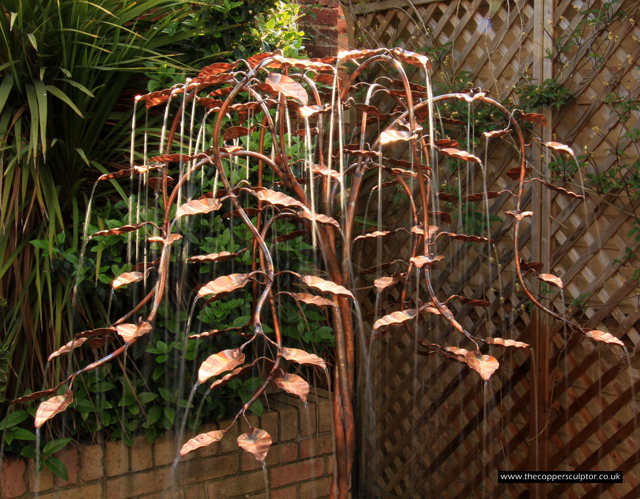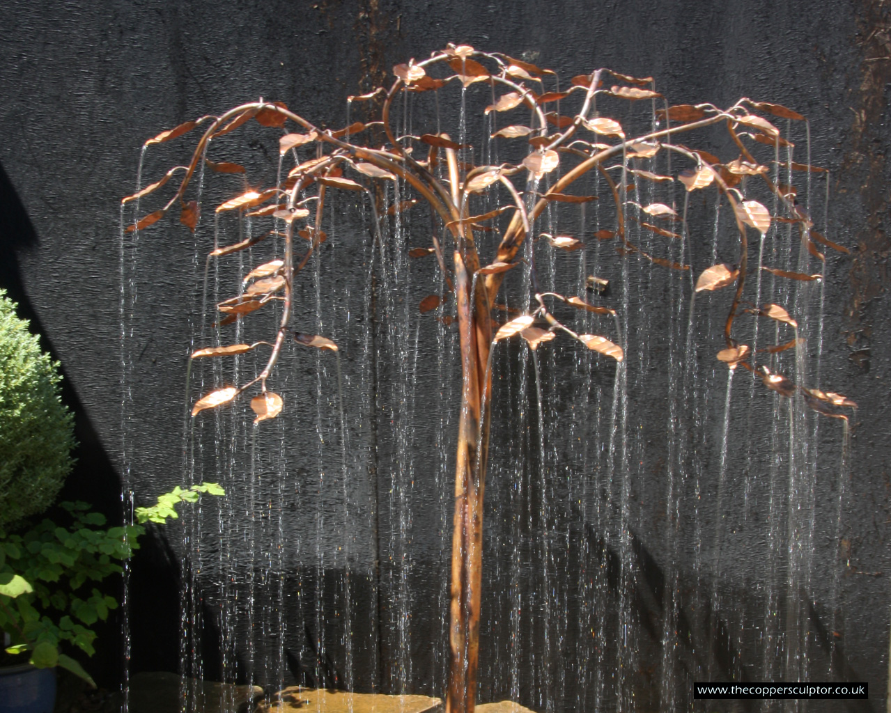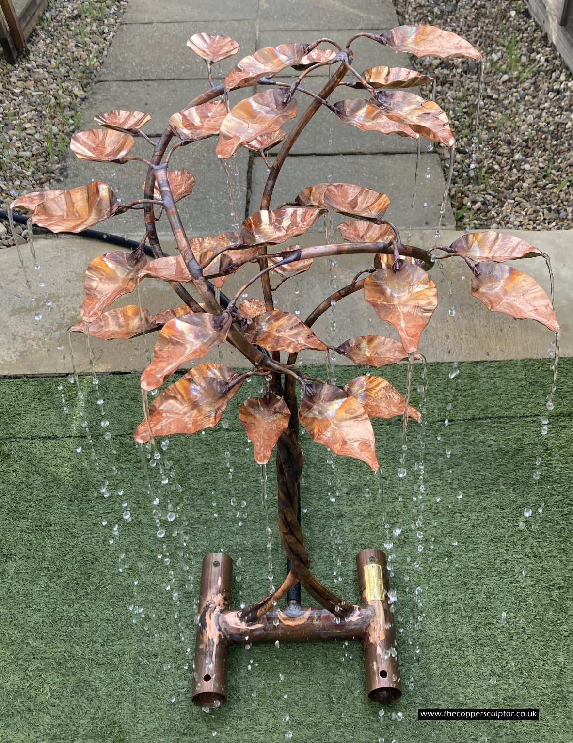 item no:18/8ET/AR Copper tree water feature. Approx 1200mm in height, 900mm in width and 900mm in depth with approx 75 water fed leaves. In situ photos