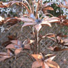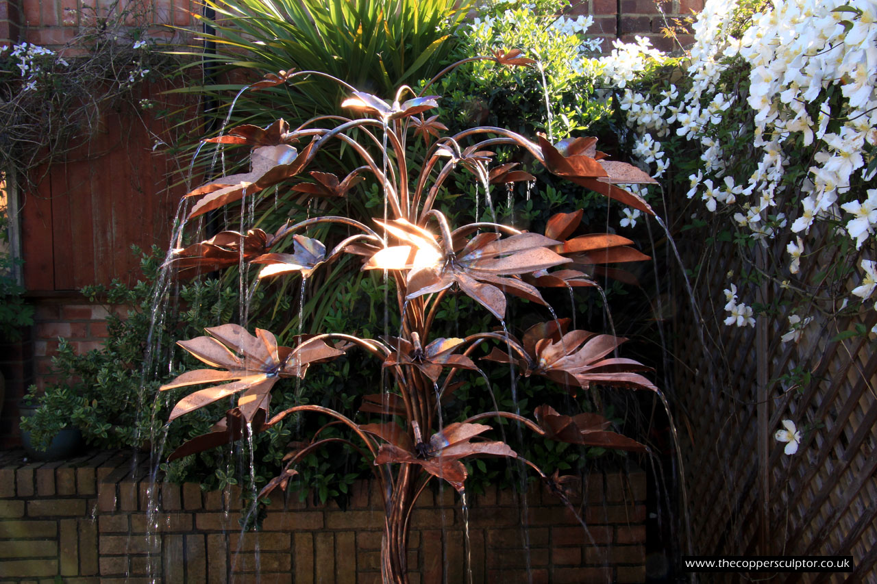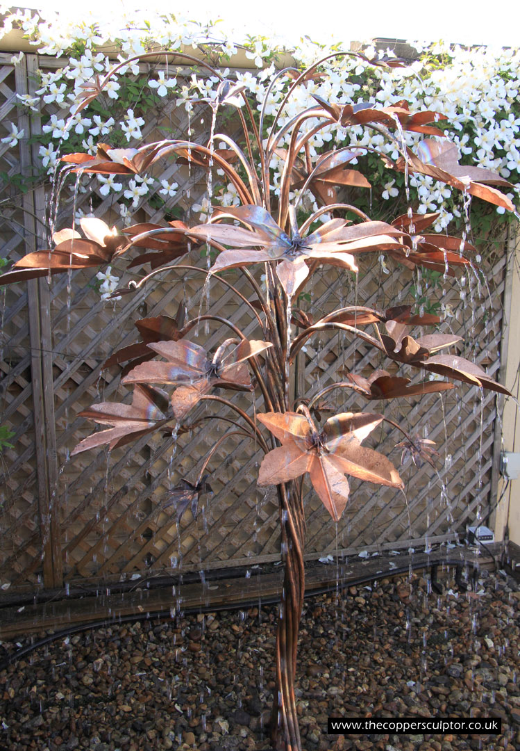 item no:4/10AR Copper water feature. Height 1100 mm, depth 660 mm, width 660 mm, elegant 4 stem 13mm trunk, 42 water fed leaves.